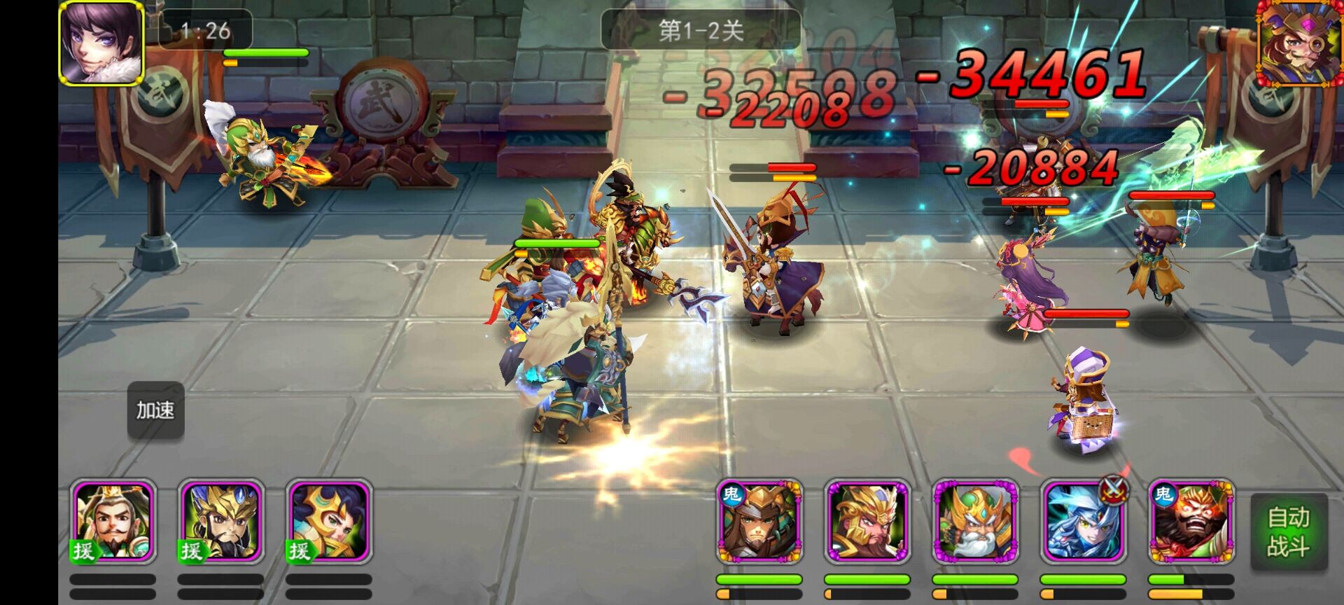 乐游三国以推图为主线,在借鉴了刀塔传奇战斗模式下,独创援军系统,打破了传统的5人战局。新增3个援军位置,让玩家精心培养的武将有了更多的勇武之地。